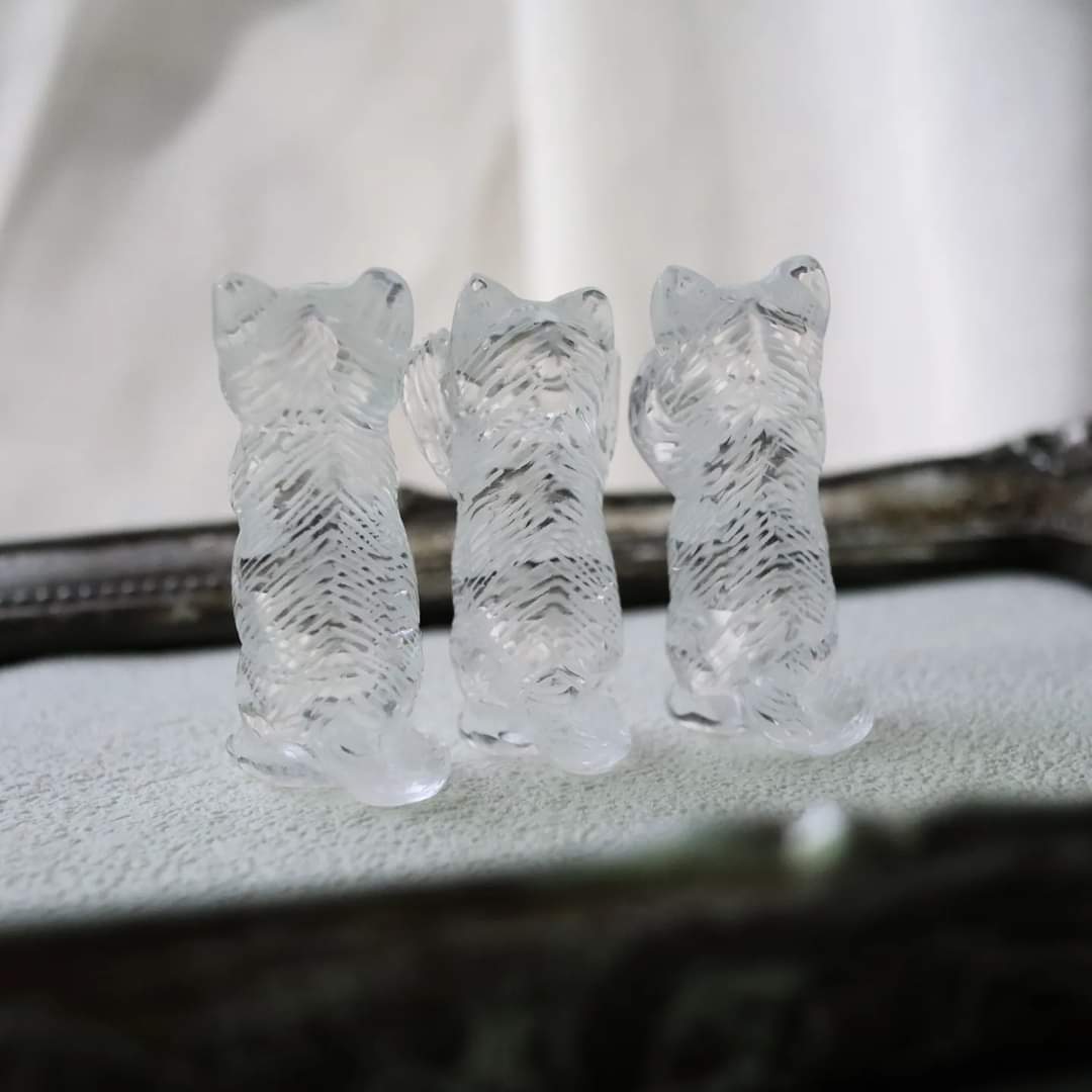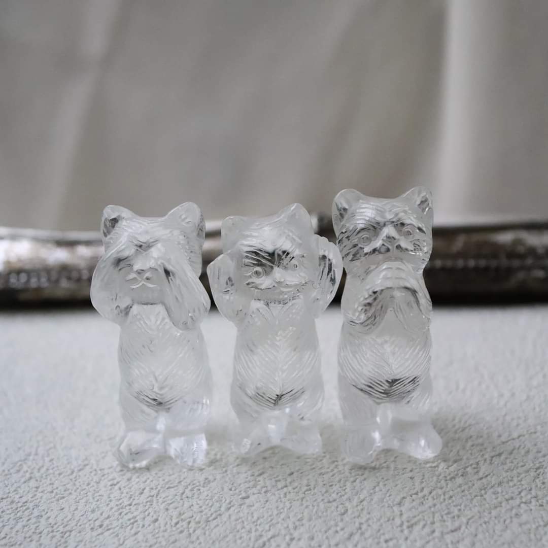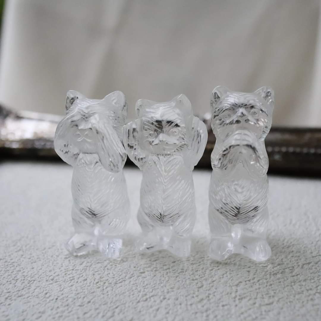 透明感溢れるクリアクオーツで出来た可愛い猫は、高品質な仕上がりを誇っています。この3ざる猫は「見ざる、聴かざる、言わざる」をテーマにしており、見る人に心和む存在感を与える一品です。