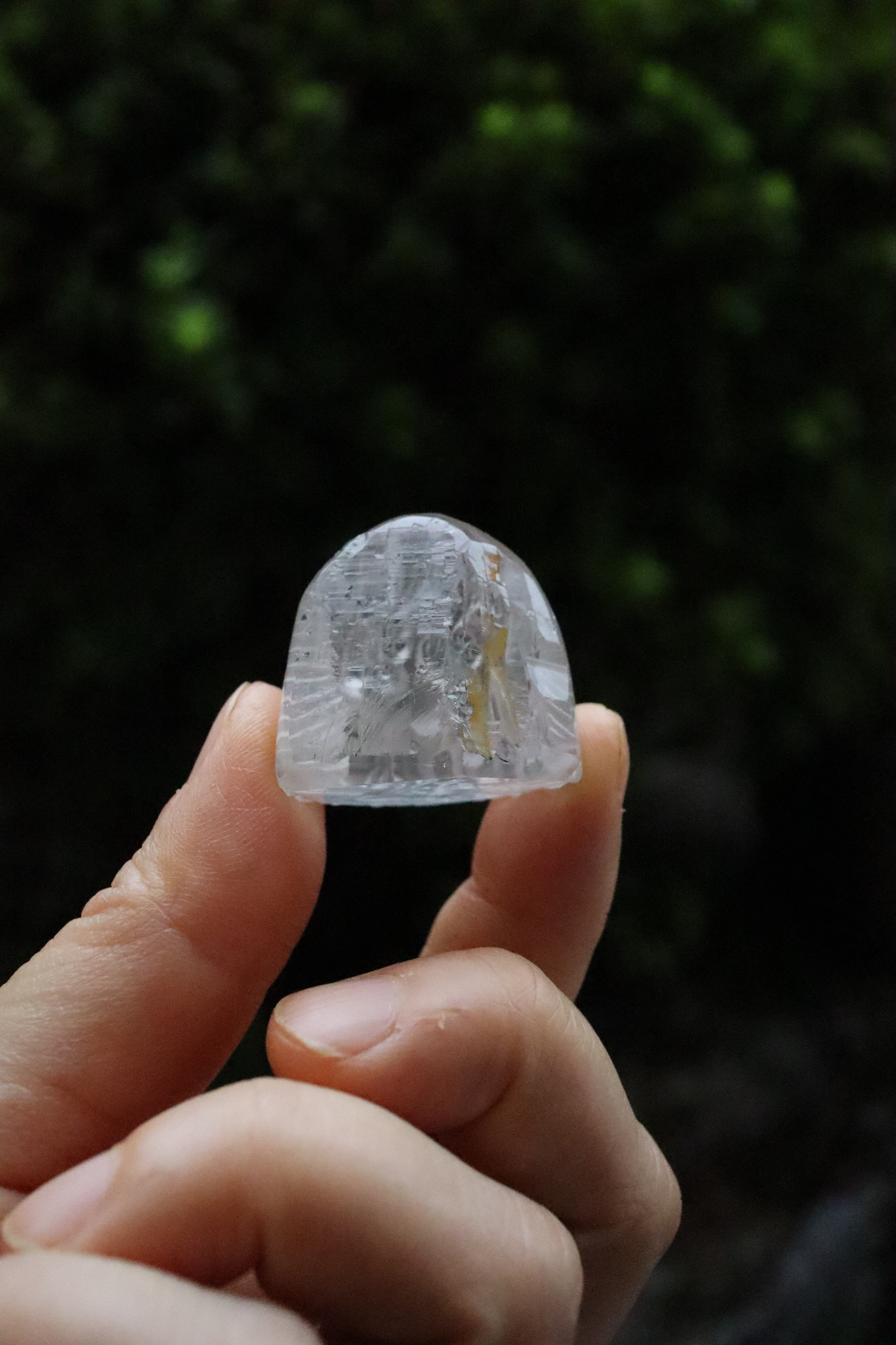 氷砂糖のように乳白色の透明感が特徴で、見る者を魅了します。彫刻の裏側には、原石の風合いを大切に残し、クローライトが共生した自然の美しさが際立つピースです。
