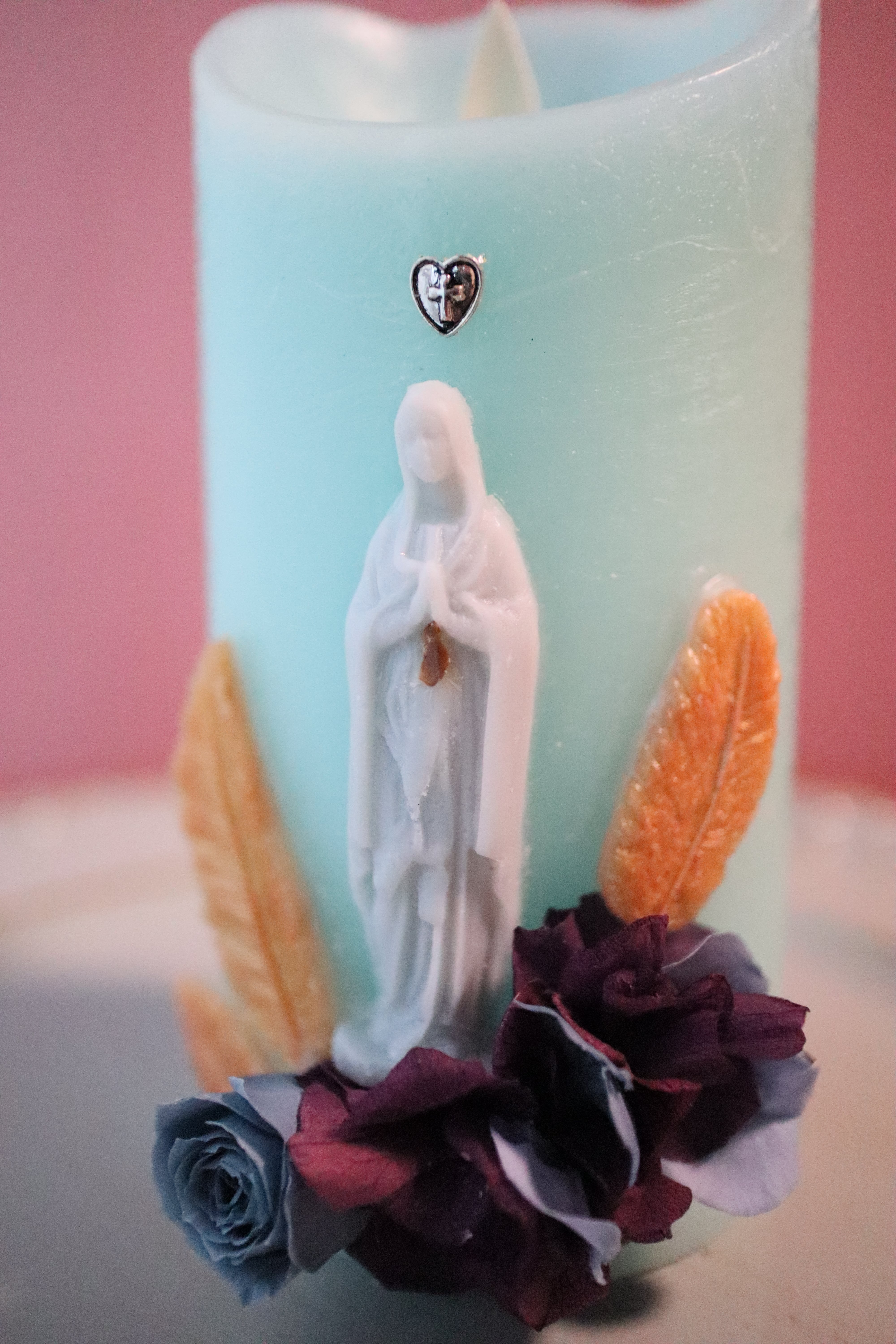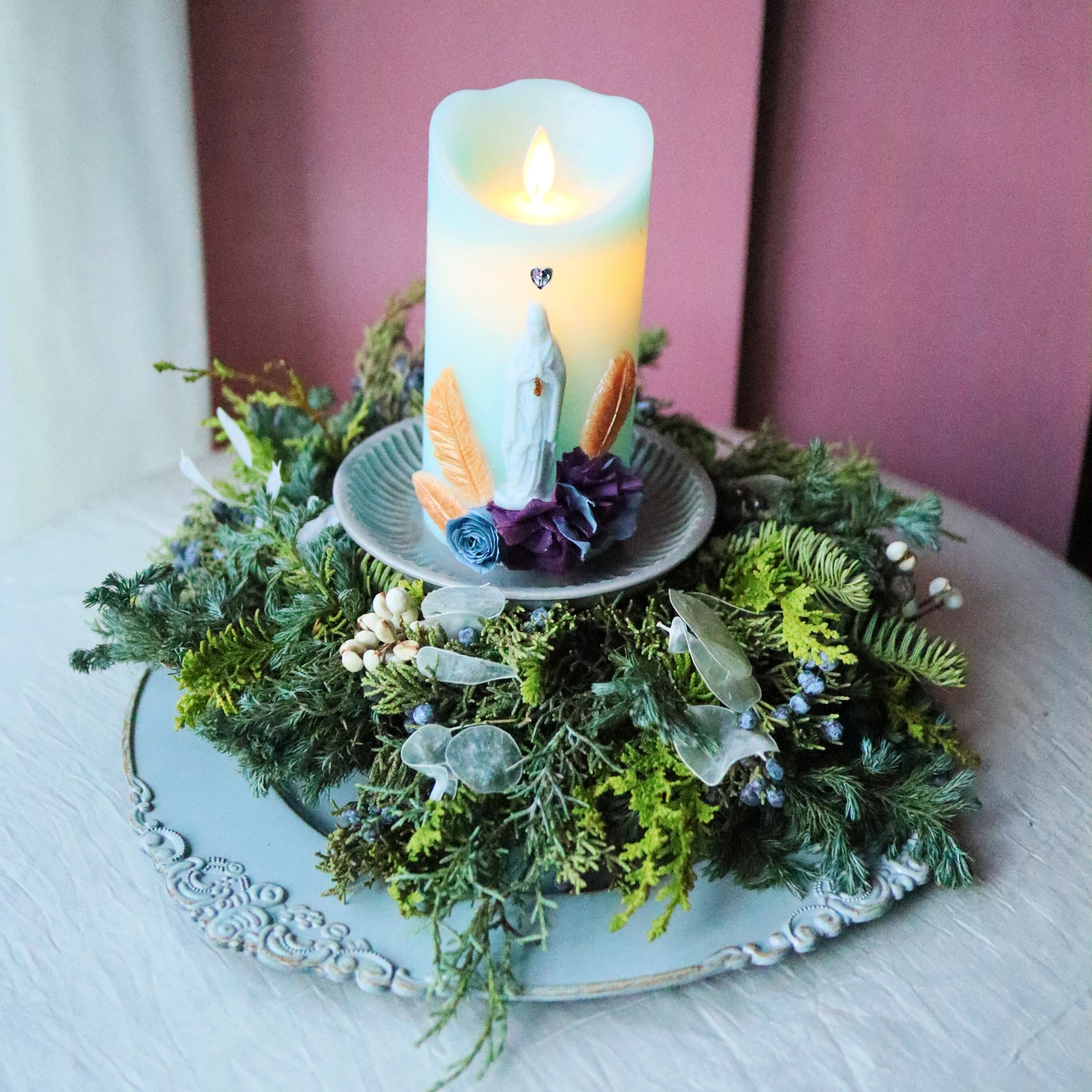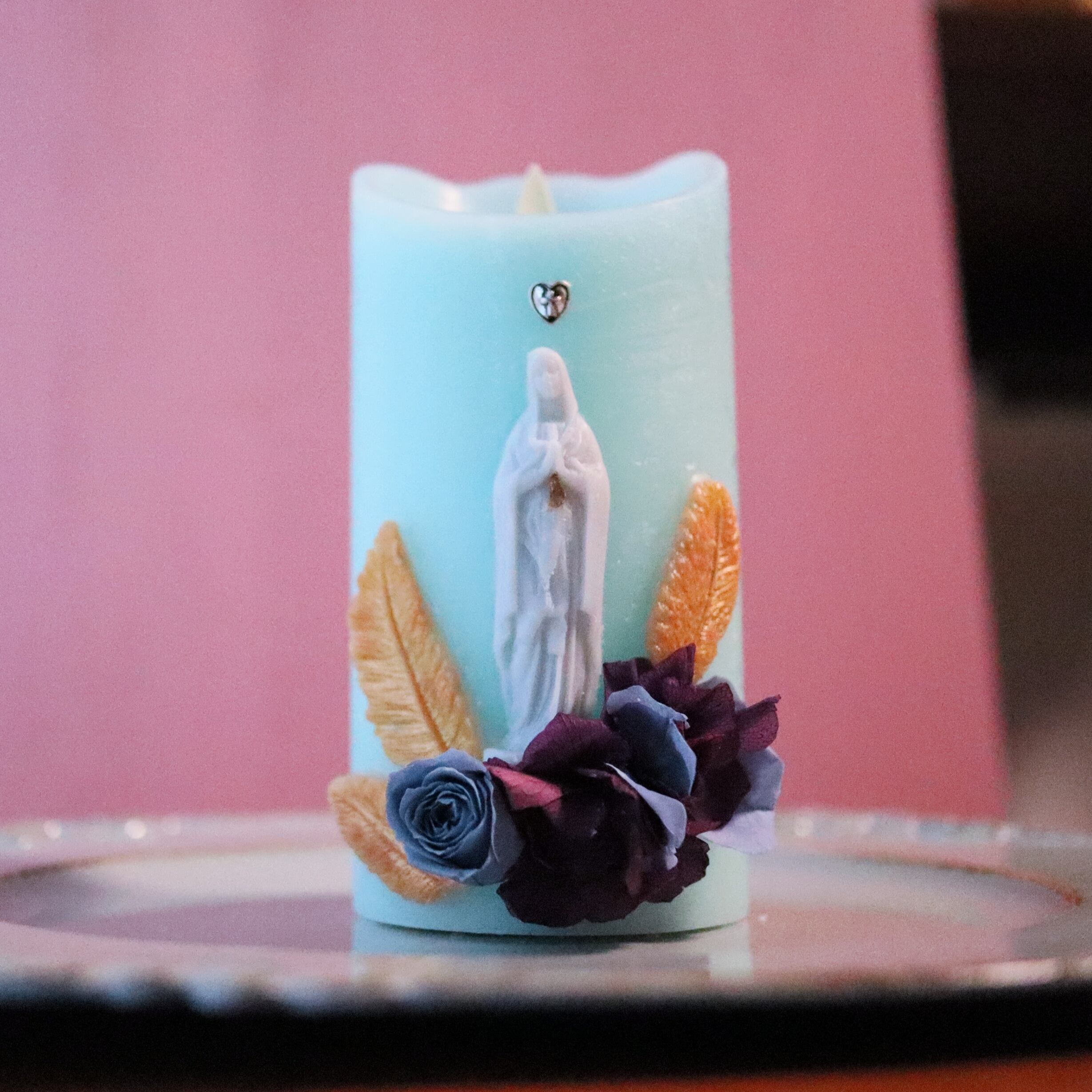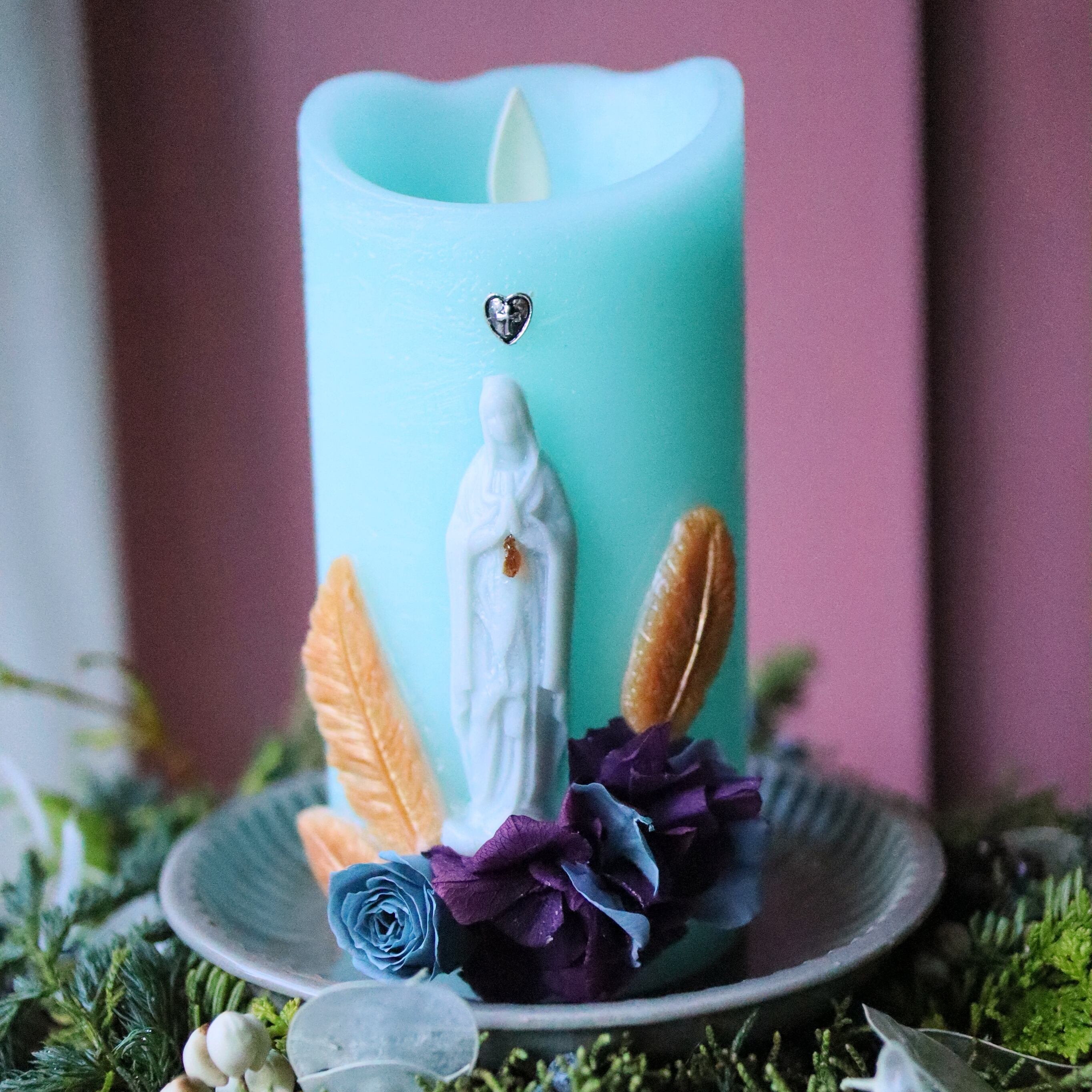 グリーンがかった爽やかなブルーが印象的なマリア様がモチーフのデコレーションLEDキャンドル